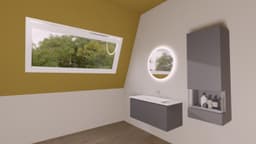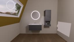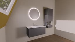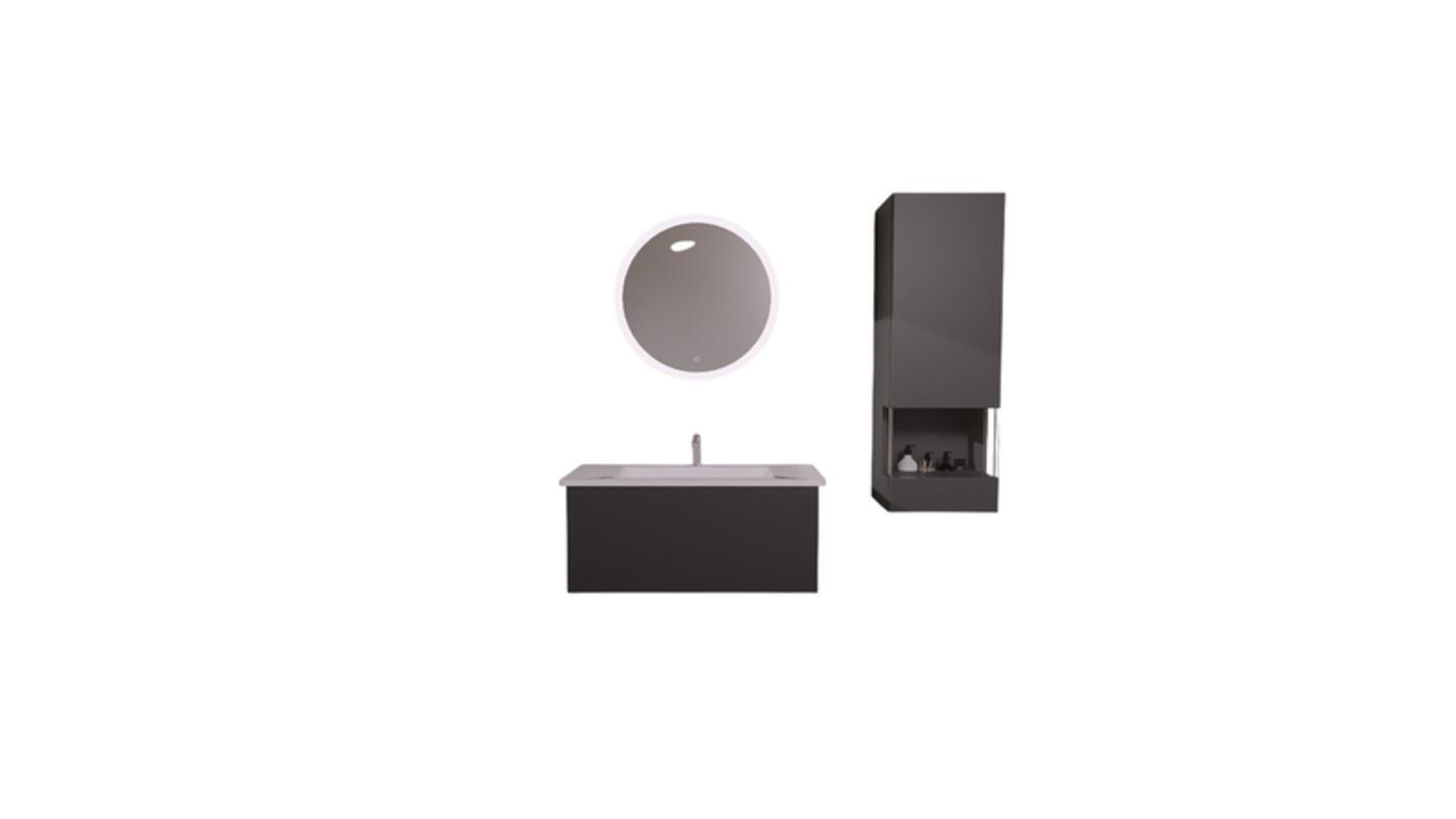 ფასადი:"Slate grey supermatt 334 - TOUCH _ ლამინირებული MDF-ის მასალა დაფარული PET ფირი (პოლიესტერის ფირი, არის მრავალმხრივი და გამძლე პლასტიკური ფირი შესანიშნავი ოპტიკური, ფიზიკური, მექანიკური, თერმული და ქიმიური თვისებებით) + დამცავი ლაქის რამოდენიმე ფენა;ქვედა მხარე დაფარული აქვს მელამინის ფენით. წინა მხარე დაფარულია ულტრაიისფერი ლაქით,რაც იცავს მასალას მზის ზემოქმედებისგან. ჰორიზონტალურად გადამრგვალებული პოლიმერული კიდეები."